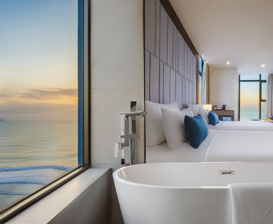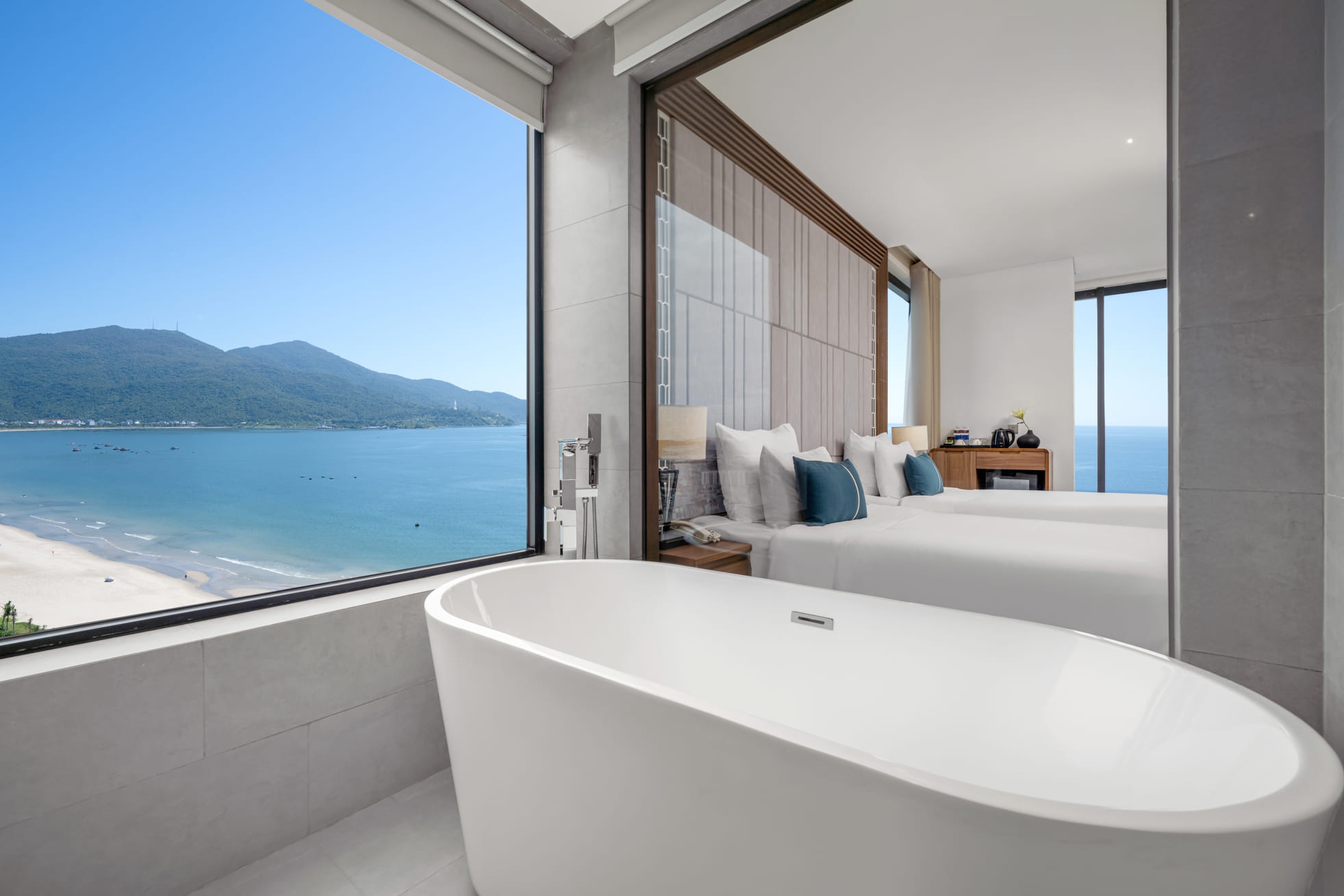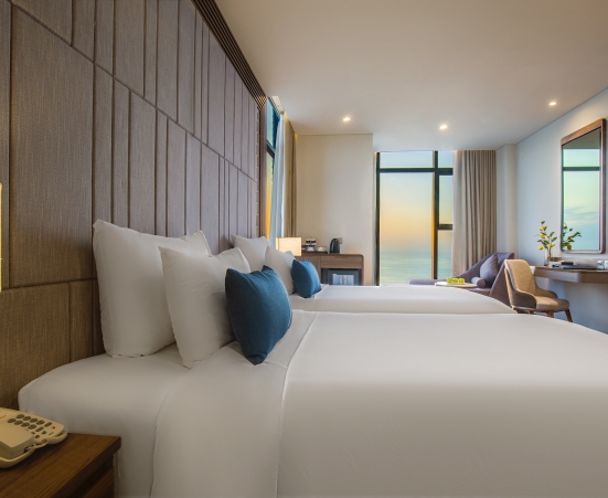 Enjoy the deep blue of the ocean by day and the charming glow of Da Nang’s streets by night with a warm cup of coffee in hand. The Deluxe Ocean Twin, located on floors 5 to 26, offers partial ocean and city views along with daily afternoon tea, promising a memorable stay.