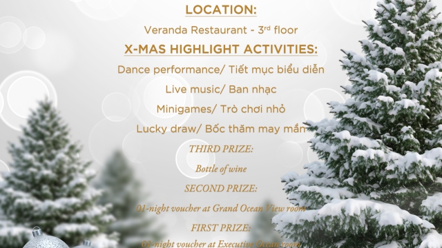 Hòa mình vào sắc màu lễ hội bên những người thân yêu tại Christmas Gala Dinner của Peninsula Hotel Danang. Cùng thưởng thức bàn tiệc buffet thịnh soạn ngập tràn màu sắc, đắm mình trong những giai điệu Giáng Sinh rộn ràng, gặp gỡ Santa Claus và tham gia những trò chơi vui nhộn.
