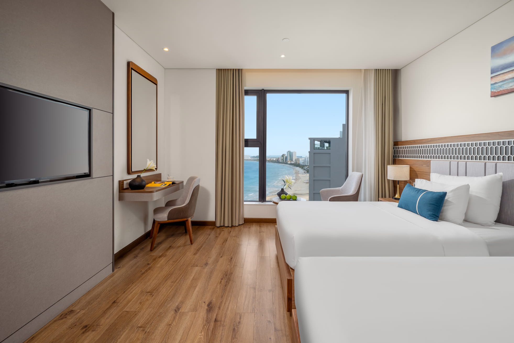 Thưởng thức màu xanh ngắt của biển vào ban ngày và ánh đèn lung linh của các con phố xinh đẹp Đà Nẵng vào ban đêm cùng ly cà phê nóng. Deluxe Ocean Twin, nằm từ tầng 5 đến tầng 26, với tầm nhìn một phần ra biển và một phần ra thành phố cùng dịch vụ trà chiều hàng ngày, hứa hẹn mang đến cho bạn một kỳ nghỉ khó quên.